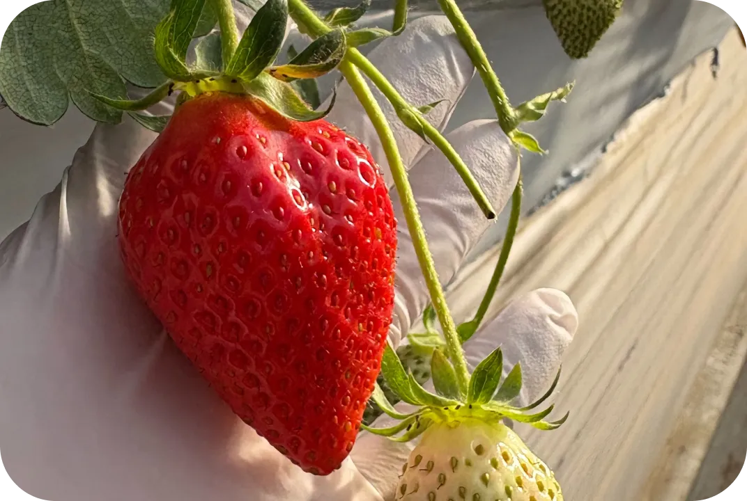 田中農園では、いちごが収穫しやすい高設栽培を採用しております。通路も広めに設計しておりますので、老若男女どなたでもお楽しみいただけます。